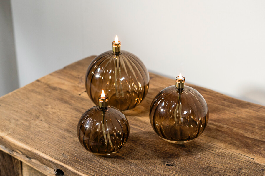 La lampe à huile ronde et élégante en verre couleur champagne et laiton (taille S) est une lampe raffinée, ornée d'un porte-mèche en laiton pour une touche luxueuse. Son design rond et élégant en fait un objet décoratif raffiné.