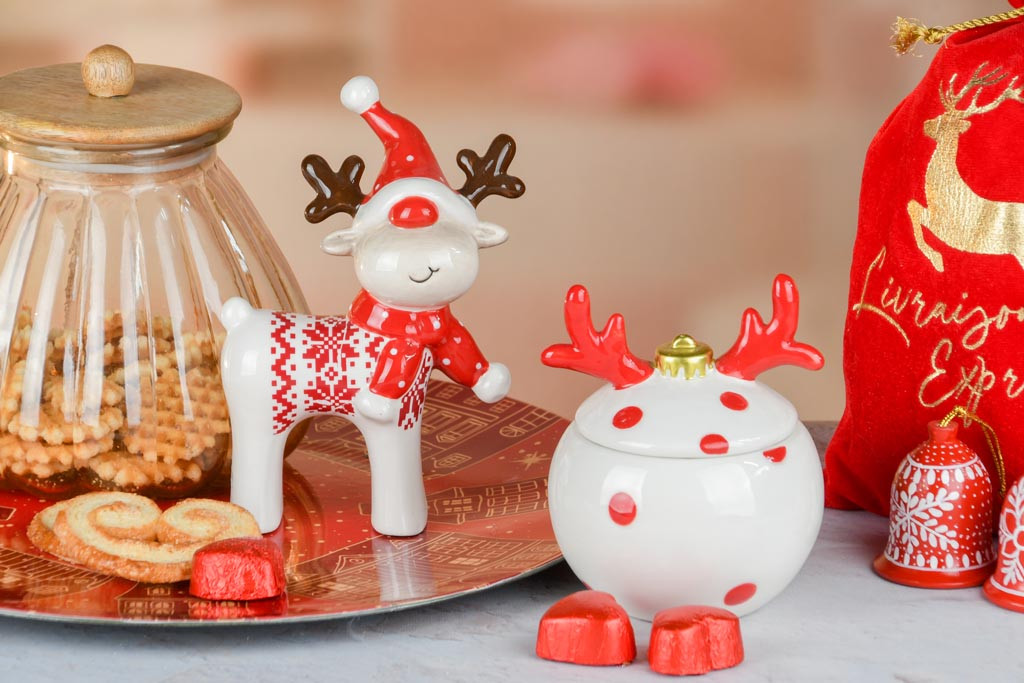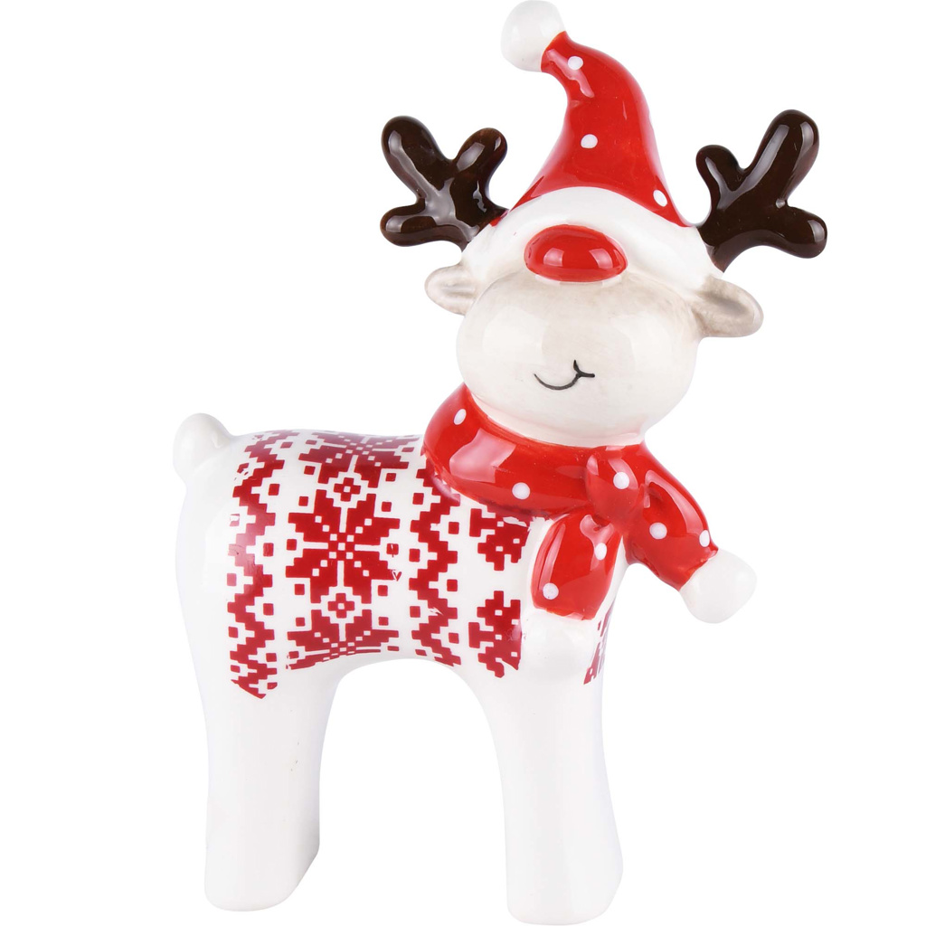 Renne av/écharpe, blanc/rouge, céramique, 10x10x14cm