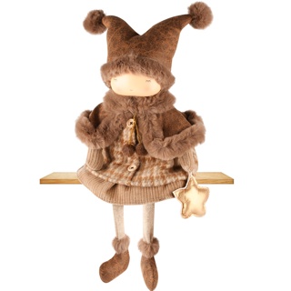 Poupée d'hiver assise av/étoile, marron, résine/tissu, 24x14x50cm
