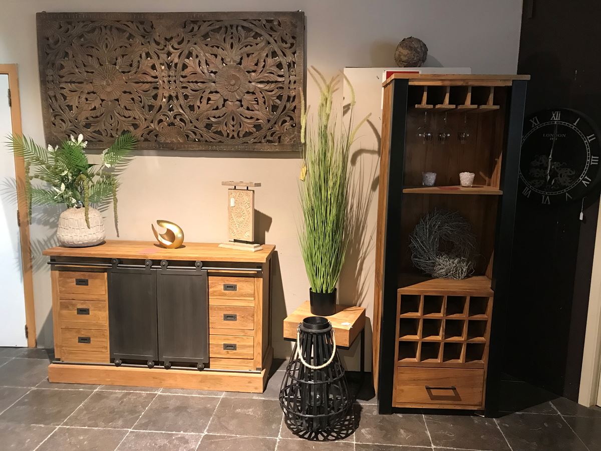 Dressoir firewood en teck recyclé avec portes métal