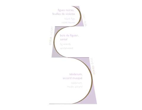 Au premier contact olfactif, Figue Noire nous séduit par ses arômes de feuilles de violette et de figue noire. Ensuite, nous sommes immergés dans un univers marqué par le bois de figuier et le santal. Enfin, les notes de fond de Figue Noire se fondent pour laisser place au Labdanum et à quelques accords musqués.