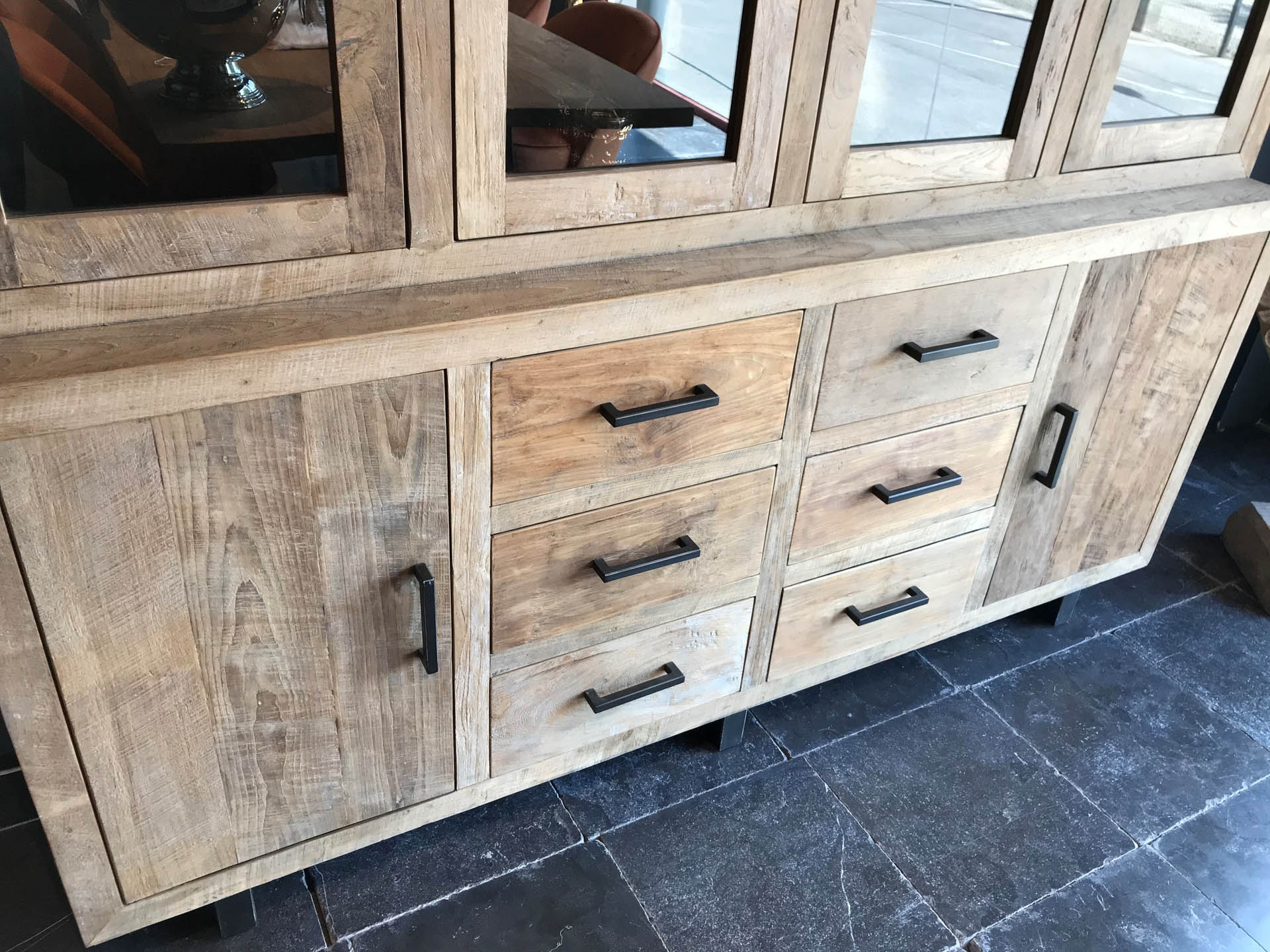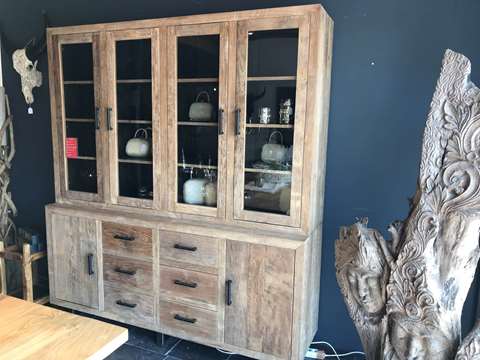 Vitrine en teck recyclé 4 portes vitrées, 2 portes, 6 tiroirs