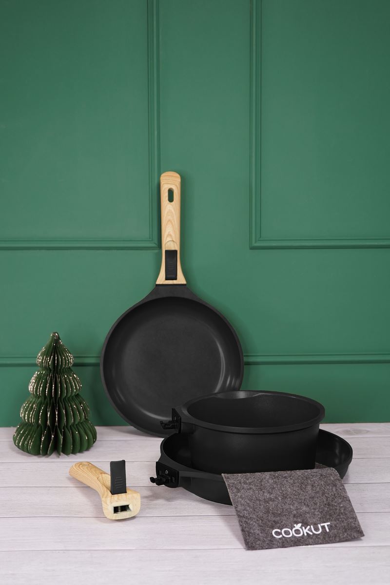 Ce pack contient une casserole 20 cm, une poêle 24 cm, une poêle 28 cm, 2 poignées amovibles et 2 feutrines de protection. Le trio est assorti aux couleurs de la gamme de l'Incroyable Cocotte.
