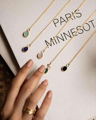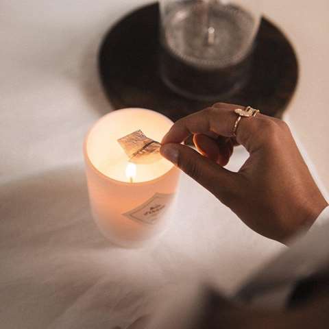 Une cire 100% naturelle à base de soja, mangue et coco, délicatement parfumée dans nos ateliers de Grasse. Une fois allumée, la mèche en coton pur diffuse un accord sensuel et poudré et dévoile un collier doré à l'or fin orné d'une pierre polie à la main.