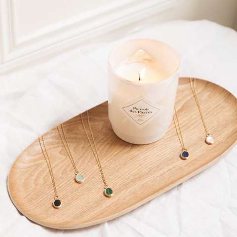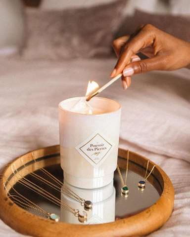 À l'intérieur de cette bougie irisée, se cache un collier orné de la pierre de votre choix, réputée pour ses bienfaits. La Fleur de Thé, devenue notre senteur best seller, installe une ambiance douce et reconfortante durant des heures et des heures... 50h pour être précis.